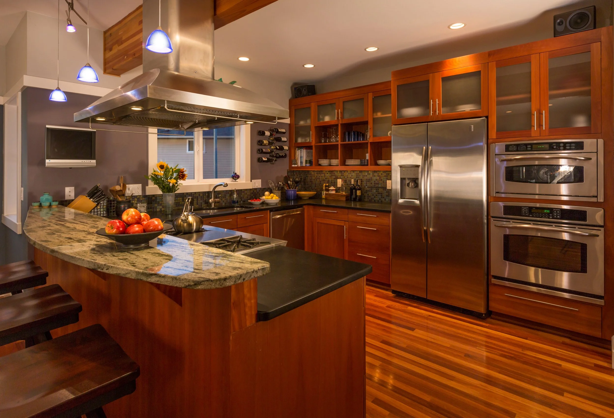 We can take care of your appliances. The refrigerator we generally roll out, sand and seal under it and roll it back in. This is the easiest way to not get a plumber involved with hooking up a new water line and possible damage to the floor at re-install. Electric stoves we remove and replace before final coat. Gas stoves we prop up and sand as far back as we can. This gas stove method is also trying to avoid a plumber to re-install the stove on the gas line.